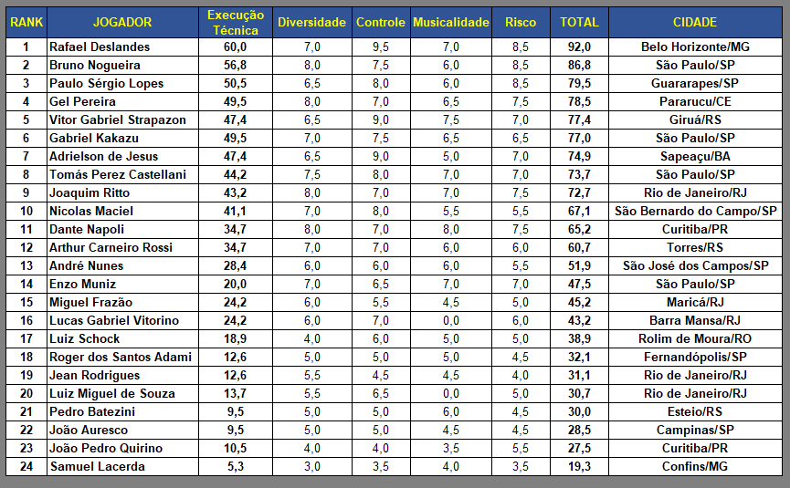No cenário brasileiro, tivemos ao todo participantes de 8 estados diferentes: São Paulo (11 jogadores), Rio de Janeiro (8 jogadores), Rio Grande do Sul (3 jogadores), Paraná (3 jogadores), Minas Gerais (3 jogadores), Ceará (2 jogadores) Bahia (1 jogador) e Rondônia (1 jogador).